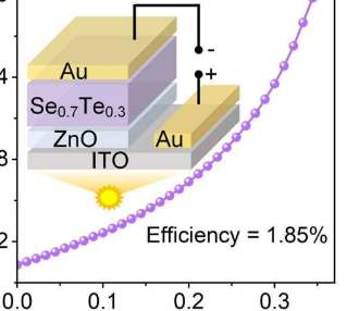 “在空气中放置九个月后,ZnO/Se0.7Te0.3太阳能电池的效率增加了一倍多,”陈说。“ZnO/Se0.7Te0.3[被证明是]一种具有能带匹配和紧密附着力的优异结,并初步实现了1.85%的效率。”