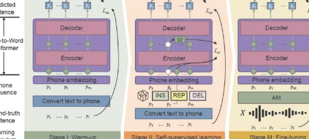 预热是第一阶段,研究人员在干净的音素序列上预训练音素转换器,该音素序列仅从未标记的文本数据转换而来,以减少注释时间。这个阶段“预热”模型,初始化基本参数以将音素序列映射到单词。