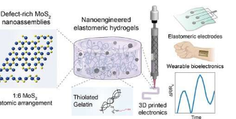 这种生物材料墨水利用了一种称为二硫化钼(MoS2)的新型二维纳米材料。MoS2的薄层结构包含缺陷中心,使其具有化学活性,并与改性明胶结合以获得柔韧的水凝胶,可与Jell-O的结构相媲美。