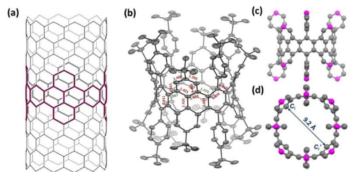 单壁碳纳米管(SWCNT的)是一类特殊的包括石墨烯片在中空管的碳材料的结构具有一个原子厚度的壁。它们被认为是开发下一代纳米电子器件最有前途的材料之一。然而,目前的电弧放电和激光汽化等生产方法无法实现原子级精确合成SWCNTs,这会影响它们的电学和光学特性。作为替代方法,研究集中在 CNBs,它是带状分子,仅由以圆形方式融合在一起的苯环组成。这些 CNB 分子有可能成为结构明确的碳纳米管生长的种子。近年来,人们对 CNBs 的自下而上有机合成的兴趣重新抬头。已经分别合成并充分表征了具有不同配置(例如扶手椅和手性边缘)的 CNB。然而,涉及锯齿形边缘 (n,0) CNT 碎片的独特构型的合成仍然难以捉摸(见图(a))。