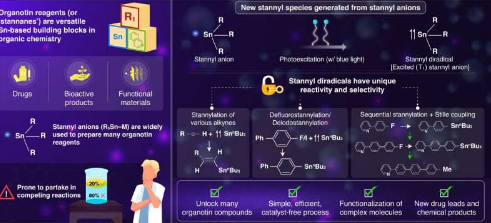 东京工业大学的科学家们开发了一种生产多种有机锡化合物的新策略,这些有机锡化合物是许多有机合成方法的基础。他们的方法是基于对苯乙烯基阴离子的光激发,这会改变其电子状态并增加其选择性和反应性以形成有用的化合物。该协议将有助于许多生物活性产品,新药和功能材料的有效合成。