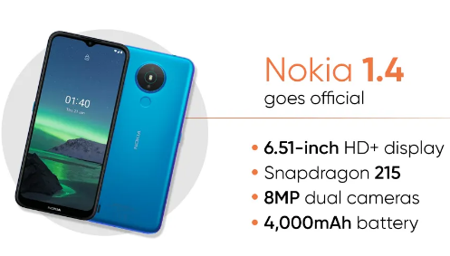 诺基亚1.4已正式宣布为最新的价格实惠的Android Go版手机,并且是去年诺基亚1.3的继任者。手机吹捧水滴显示屏以容纳自拍相机,带有双传感器的圆形相机模块以及用于安全性的物理指纹传感器。诺基亚1.4的关键规格包括高通Snapdragon 215 SoC,高达64GB的可扩展存储,Android 10(Go版)手机,5MP自拍快照器和6.51英寸HD +显示屏。该手机的左侧有一个专用按钮,可以触发Google Assistant。这是诺基亚1.4的价格,规格和可用性的详细信息。