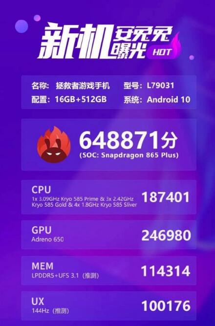 在AnTuTu的CPU,GPU,内存和UX测试中,Lenovo Legion游戏手机得分187,401、246,980、114,314和100,176。它记录了平均基准得分648,871。